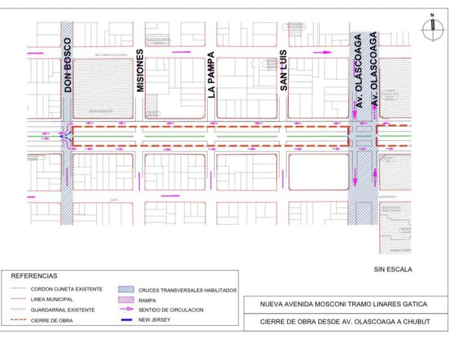 Con la incorporación de estos nuevos 400 metros de intervención, el tramo inhabilitado en el eje central —en sentido este-oeste— se extiende desde Chubut hasta Don Bosco. Las colectoras continúan habilitadas y los desvíos se encuentran debidamente señalizados.
