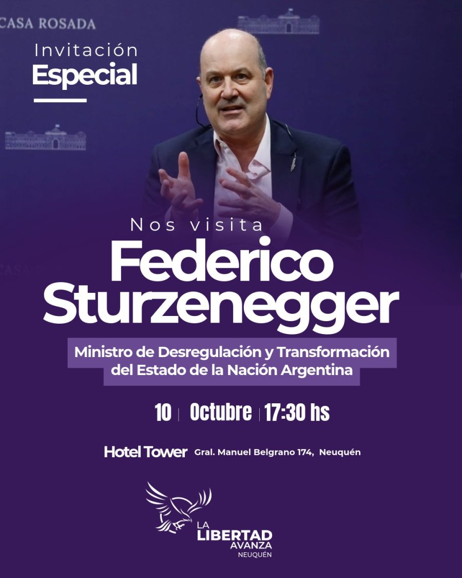 El ministro de Desregulación y Transformación del Estado de la Nación, Federico Sturzenegger, estará en la ciudad de Neuquén este viernes feriado 10 de octubre.