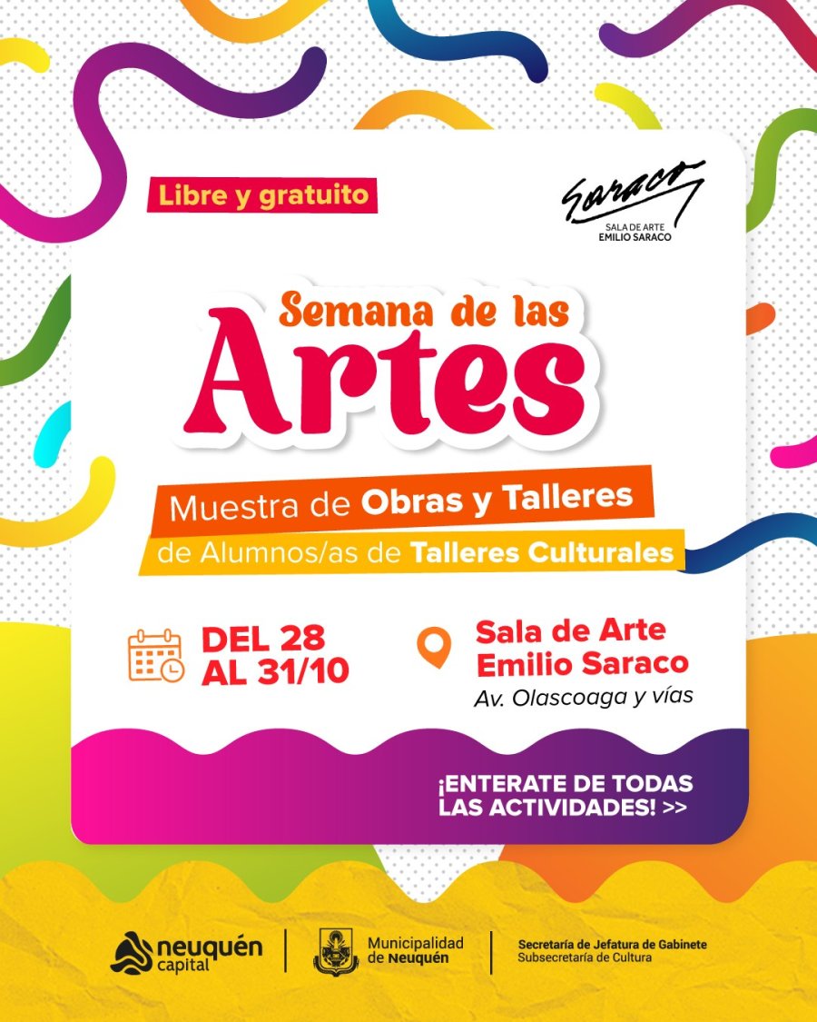 La Municipalidad de Neuquén invita a la comunidad a participar de la Semana de las Artes en la Sala Emilio Saraco, una propuesta abierta y gratuita que se desarrollará del 28 al 31 de octubre, y que reúne producciones y expresiones artísticas de estudiantes, docentes y talleristas de la ciudad.