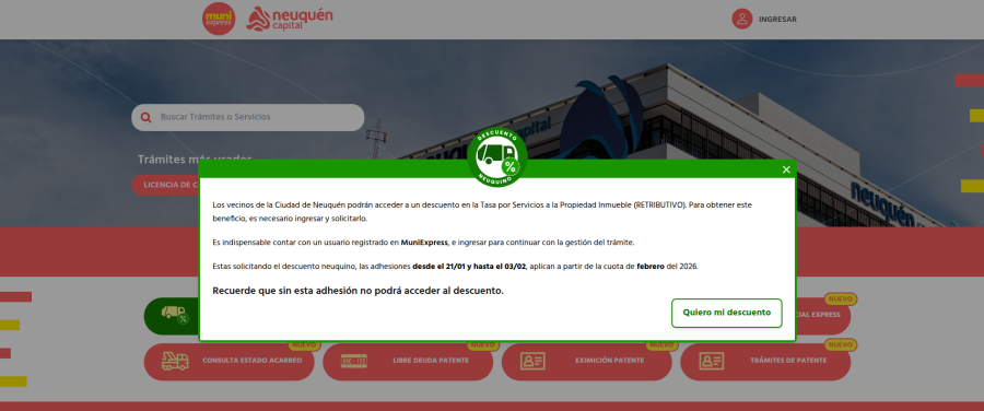 Desde la municipalidad recordaron que hay plazo para adherirse al Botón Descuento Neuquino, que otorga beneficios de hasta el 100% en los impuestos retributivos. Los vecinos pueden adherirse a través del portal Muni Express en la web de la Municipalidad (www.neuquencapital.gov.ar).