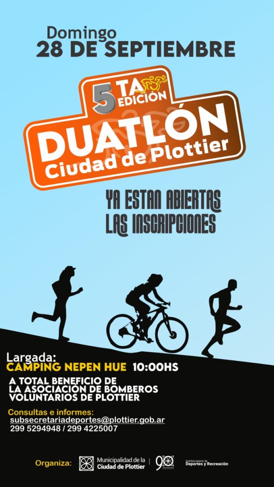 La Subsecretaria de Deporte y Recreación de Municipalidad de Plottier organiza por 5° año consecutivo el duatlón, una prueba combinada deportiva, única en la localidad de Plottier. Esta edición se llevará adelante el domingo 28 de septiembre, con largada en el Camping Nepen Hue a las 10 hs. y el total de lo recaudado por las inscripciones será destinado al cuerpo de Bomberos de la ciudad.